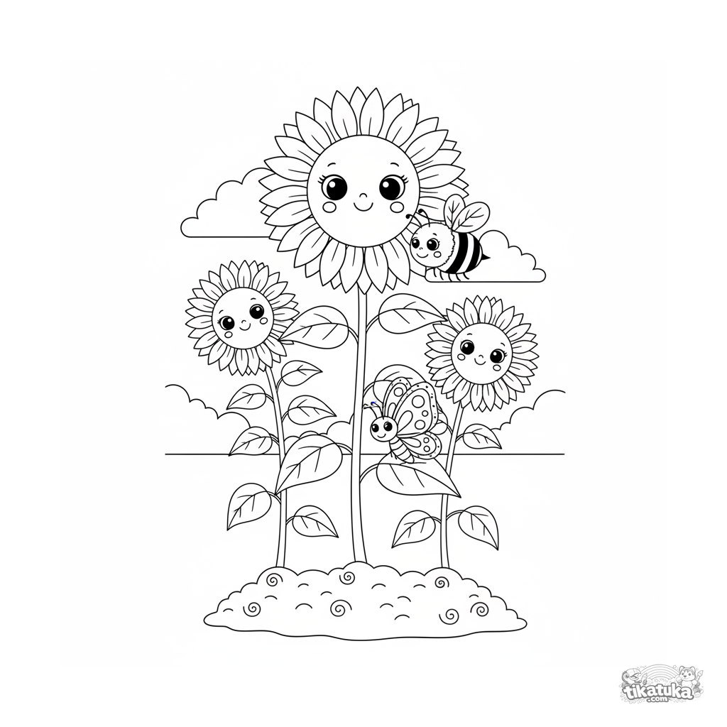 Página para colorir para crianças 4-6: um campo ensolarado com girassóis, uma abelha e uma borboleta. Detalhes equilibrados e formas claras.