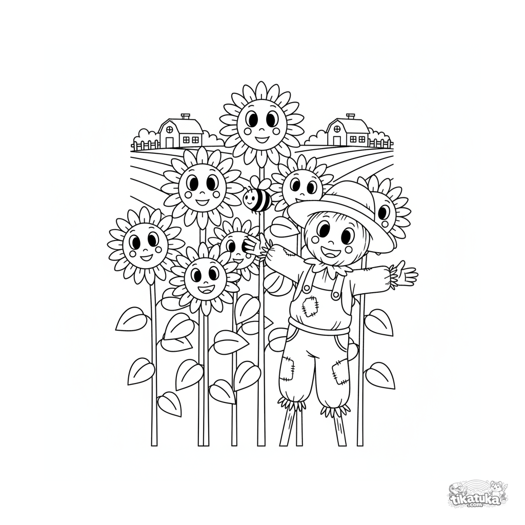Página para colorir para crianças 4-6: um campo alegre de girassóis com um espantalho amigável e uma abelha. Cena de verão brilhante.