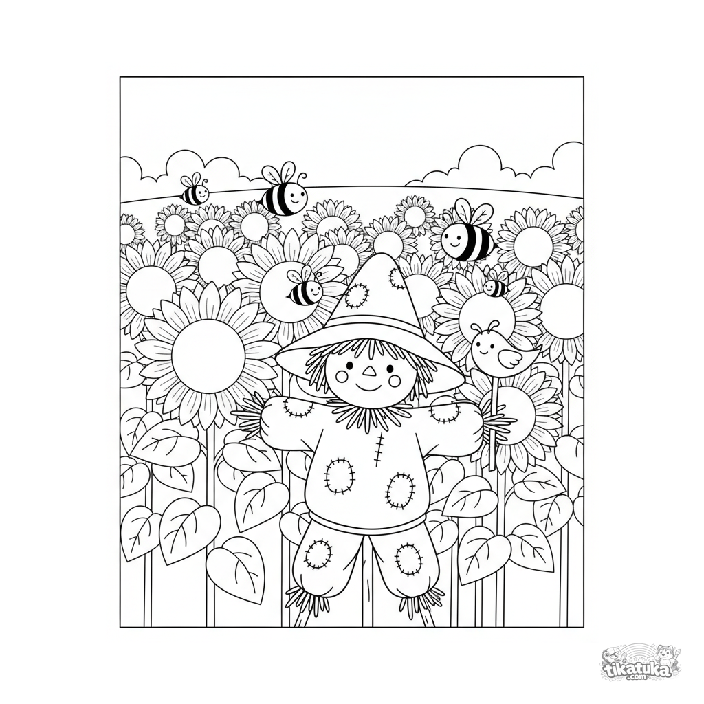Página para colorir para crianças de 4-6 anos: um campo alegre de girassóis com um espantalho amigável e abelhas voando.