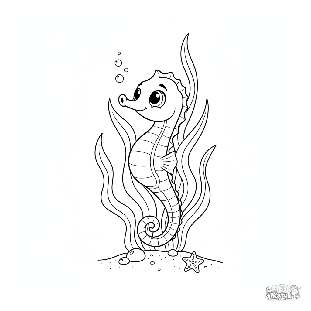 Página para colorir para crianças 4-6: um cavalo-marinho agarra-se a uma alga em águas rasas iluminadas pelo sol.