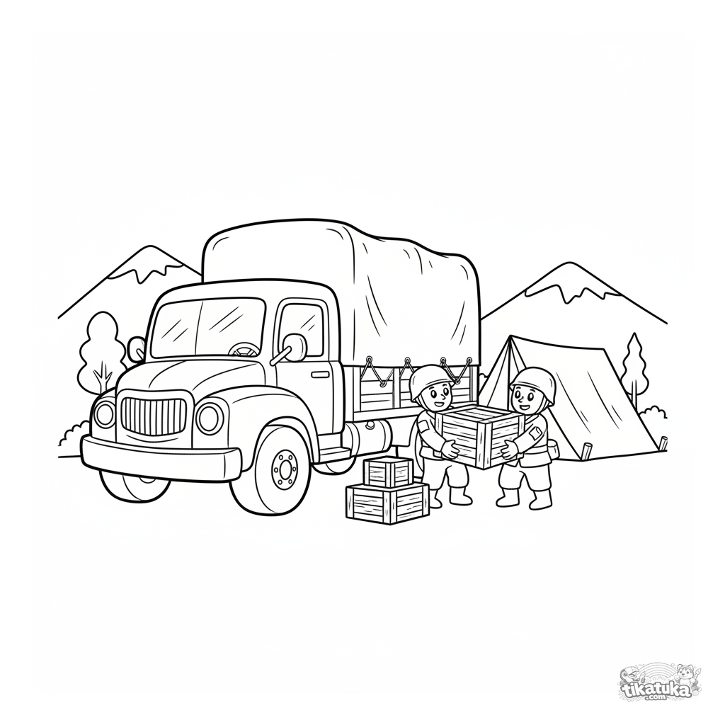Página para colorir para crianças de 7-9 anos: um caminhão de suprimentos militares está descarregando caixas perto do quartel-general de campo. Soldados carregam a carga para as barracas.
