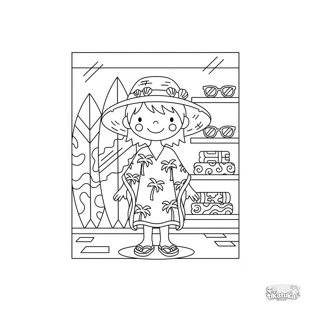 Página para colorir para meninas 10-12: um manequim alegre na vitrine de uma loja de surf exibe um conjunto de praia completo: um canga, chapéu e chinelos.