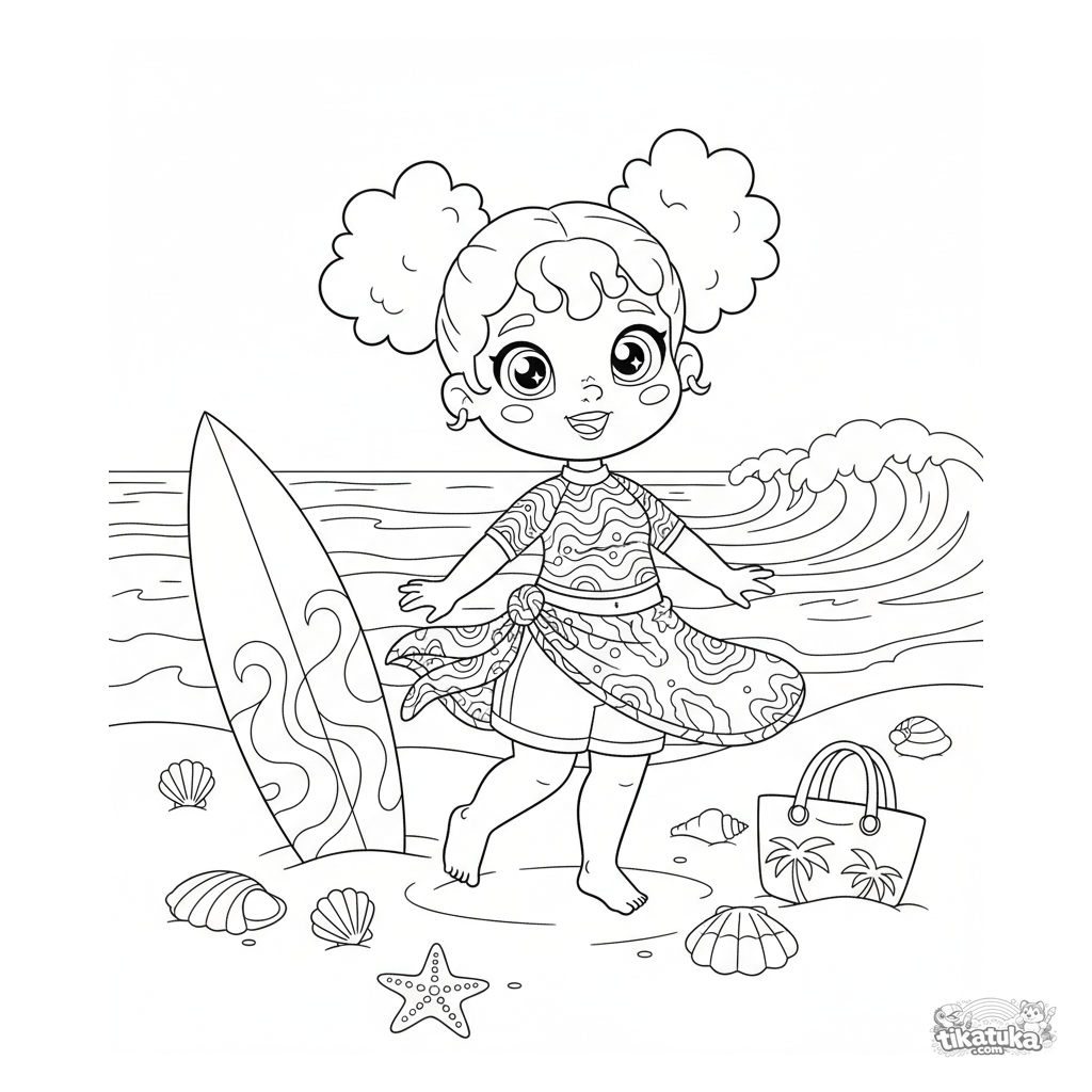 Página para colorir vibrante para meninas 10-12: uma garota surfista em roupa de praia girando alegremente na praia. Prancha de surfe, conchas do mar e roupas detalhadas.