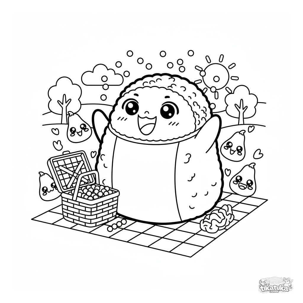 Página para colorir de um rolo de sushi celebrando perto de uma cesta de piquenique, jogando confete de ovas de peixe. Para crianças de 4 a 6 anos. Com alga nori, arroz, sachês de molho shoyu e fatias de gengibre.