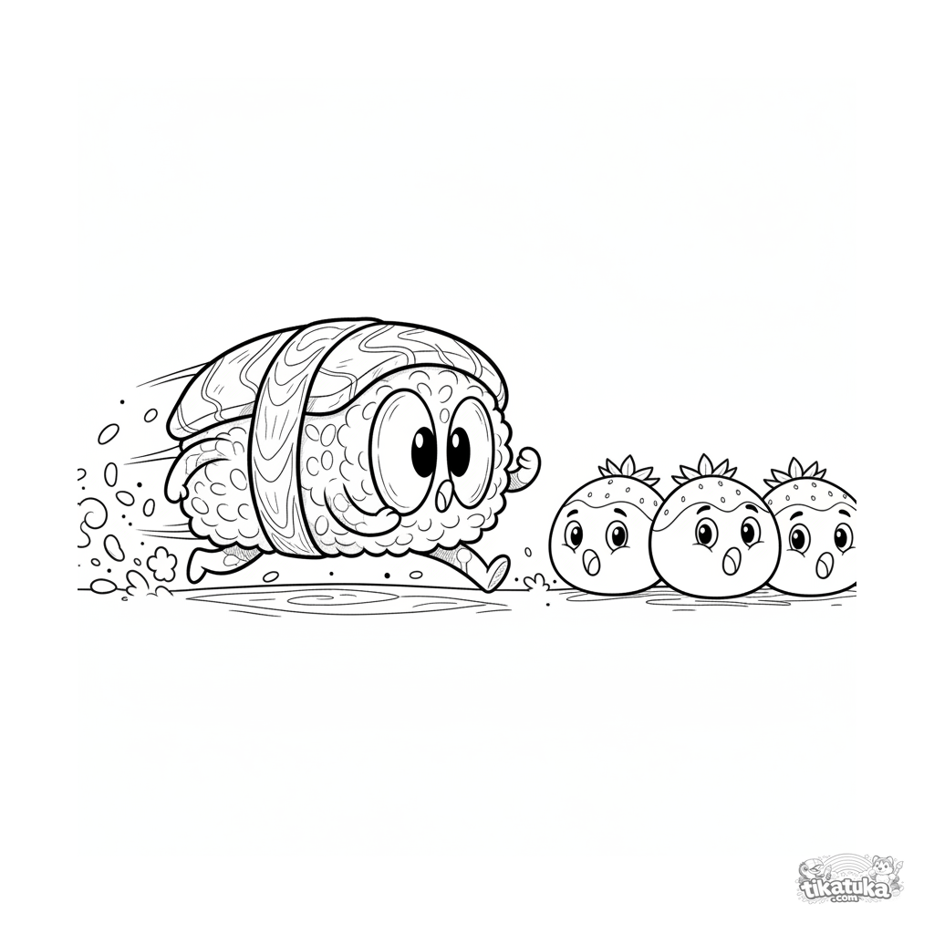 Página para colorir dinâmica para 10-12 anos: um rolinho de sushi correndo ao lado de mochis surpresos. Linhas de velocidade e fundo detalhado.