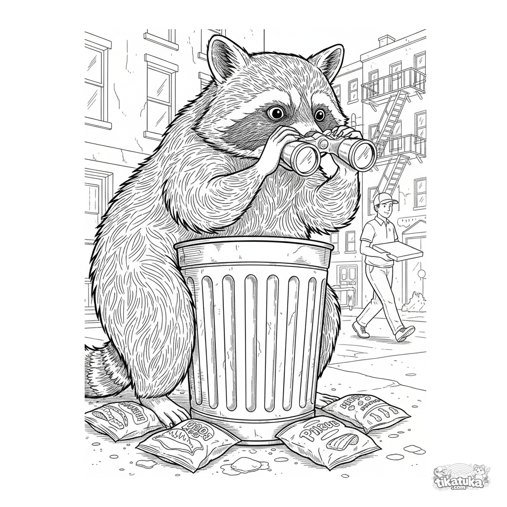 Página para colorir para crianças 10-12: um guaxinim suspeito numa lixeira com binóculos, observando uma entrega de pizza num beco da cidade.