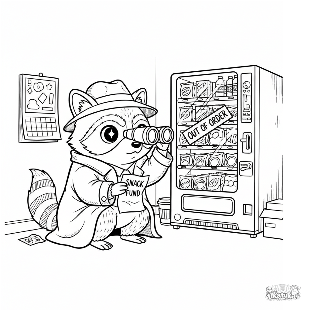 Página para colorir complexa no estilo graphic novel para crianças de 10-12 anos: um guaxinim espião suspeito de trench coat observa uma máquina de venda automática quebrada. Meme engraçado com estética noir.