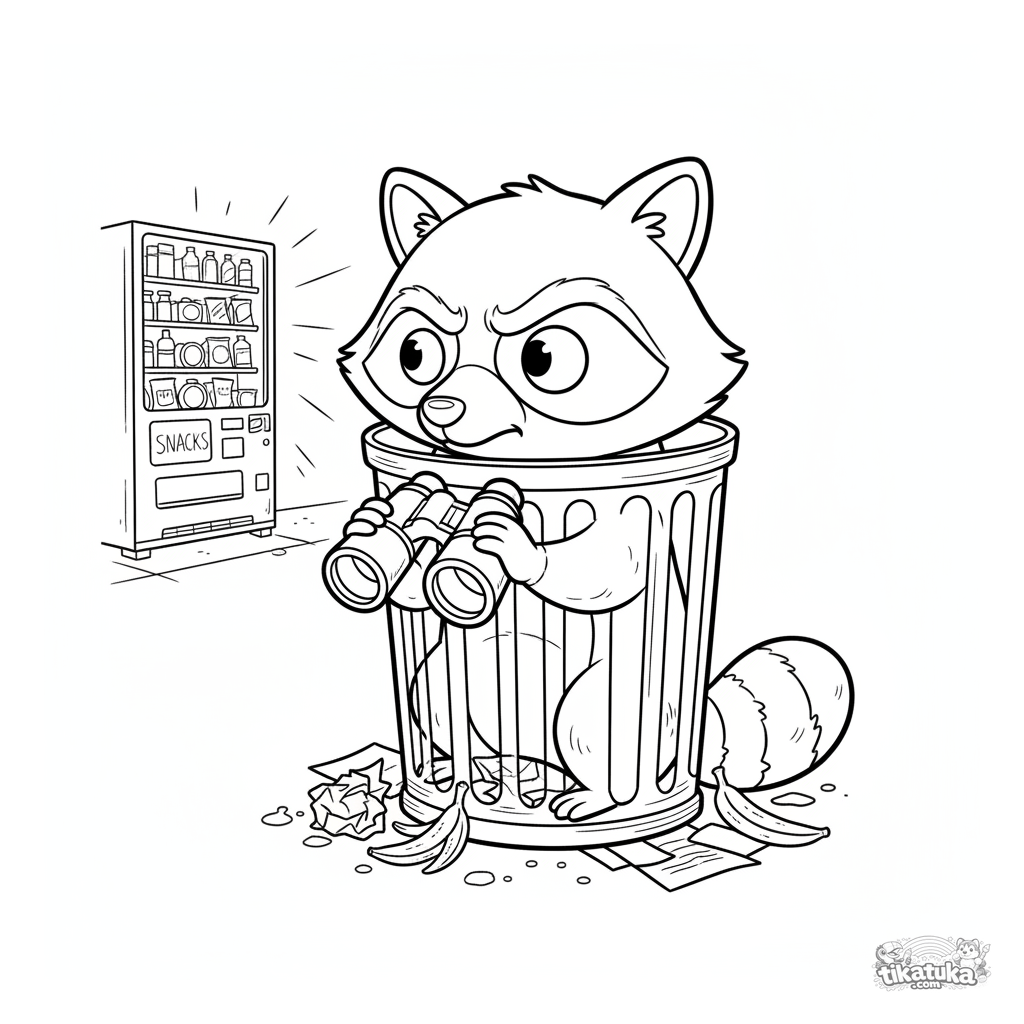 Página para colorir para crianças 10-12: um guaxinim suspeito espiando de uma lixeira em um beco, segurando firmemente os binóculos. Cena detalhada em estilo graphic novel.