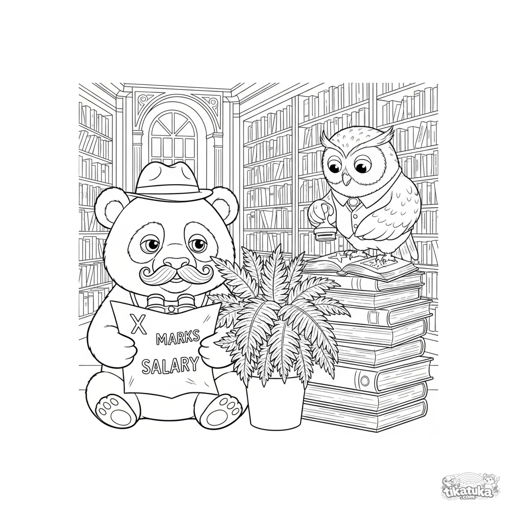 Página para colorir detalhada estilo graphic novel: um panda-vermelho espião suspeito em uma biblioteca perseguindo o salário. Meme engraçado com mapa, coruja bibliotecária e samambaia para se esconder.