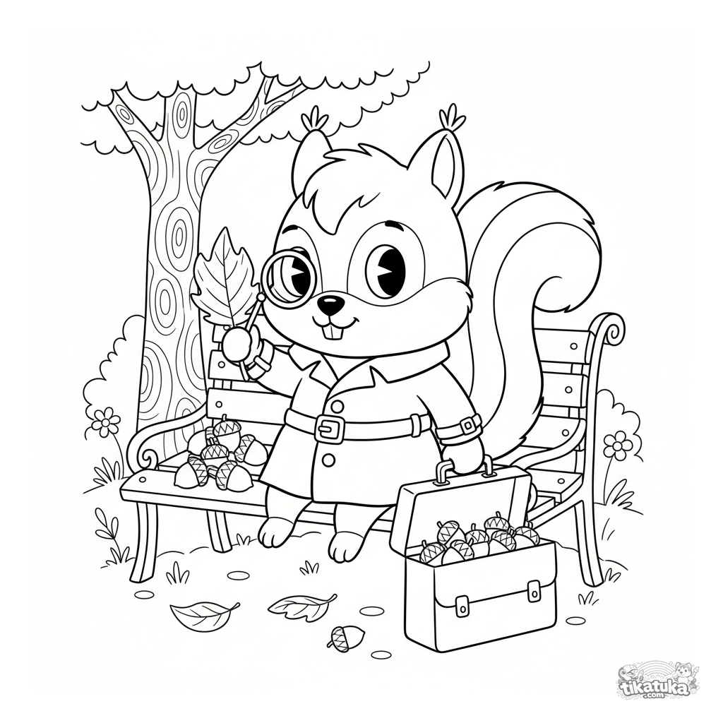 Página para colorir em estilo retrô: um esquilo suspeito de trench coat e monóculo num banco de parque examina uma folha. Meme absurdo e detalhado para crianças 10-12.