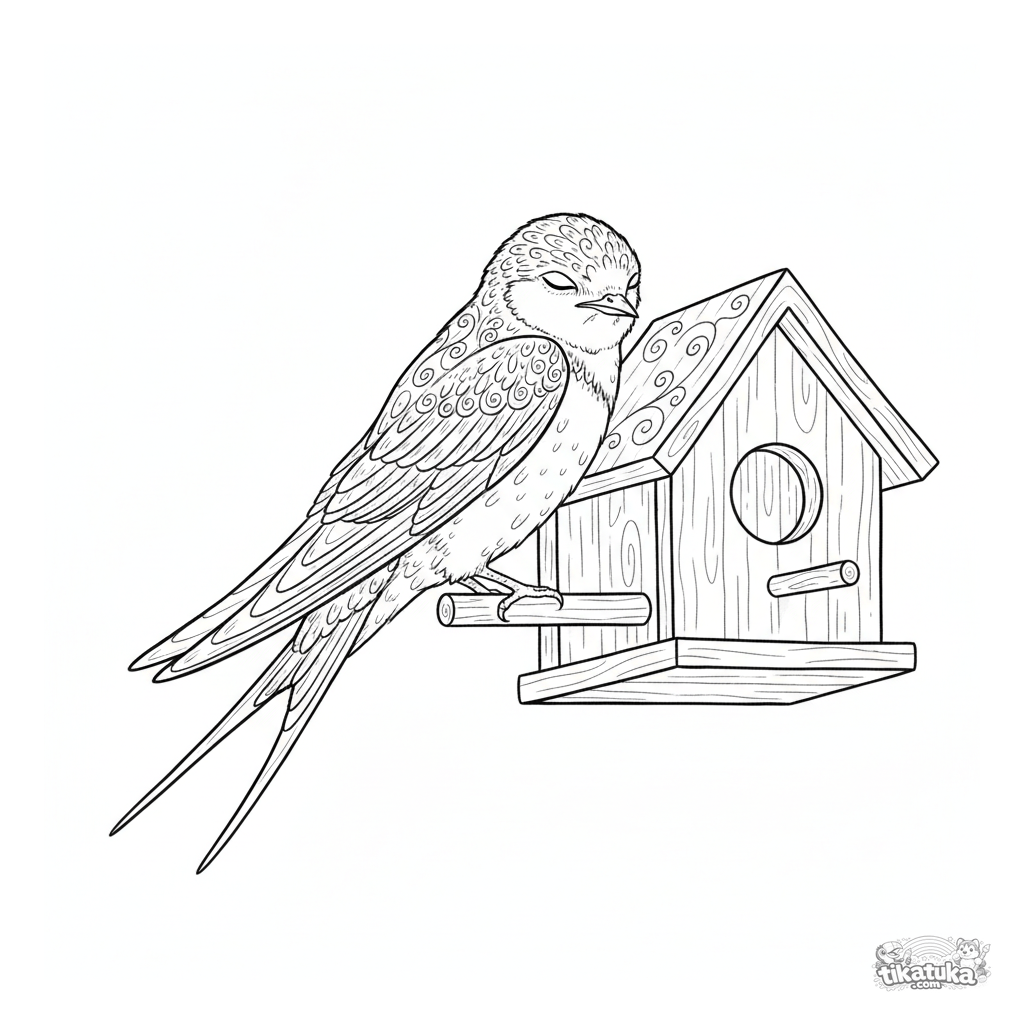 Página para colorir estilo esboço aquarela para 10-12 anos: uma andorinha cansada descansando no parapeito de uma casa de pássaros.