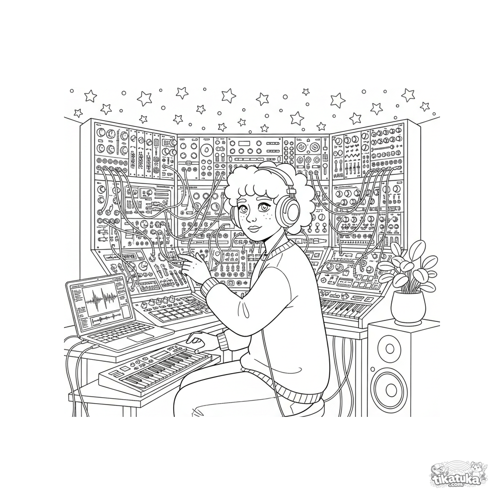 Página para colorir para crianças de 10-12 anos: um produtor de música eletrônica fazendo uma faixa em um estúdio no porão. Detalhes: sintetizador modular, cabos, laptop, estrelas brilhantes.
