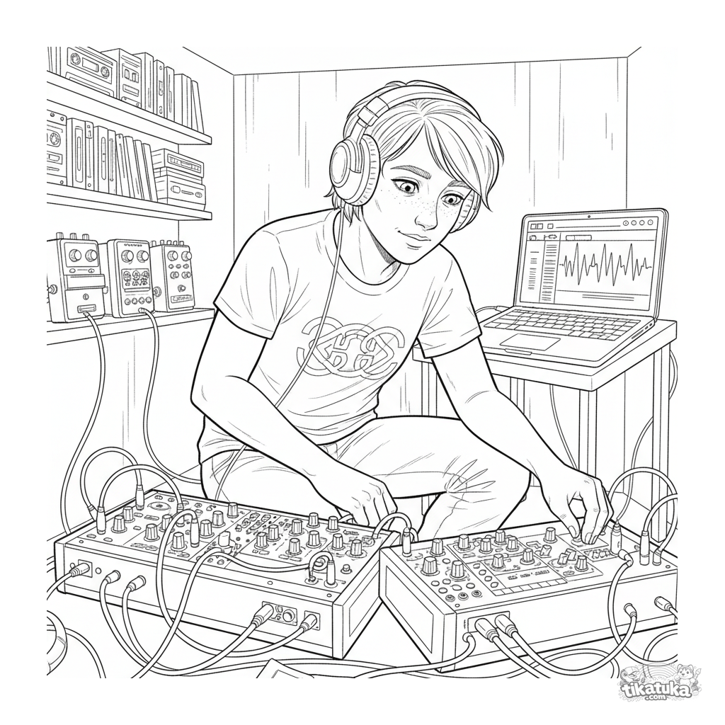 Página para colorir para crianças de 10-12 anos: um músico criando música eletrônica em um sintetizador em um estúdio no porão. Cena detalhada em estilo sketch urbano.