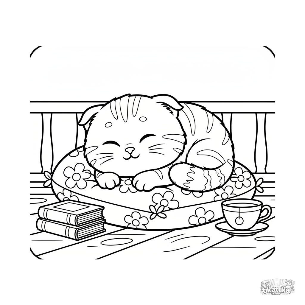 Página para colorir para crianças pequenas: um gatinho fofinho cochila em uma almofada na varanda de verão. Formas grandes e simples com margens amplas.