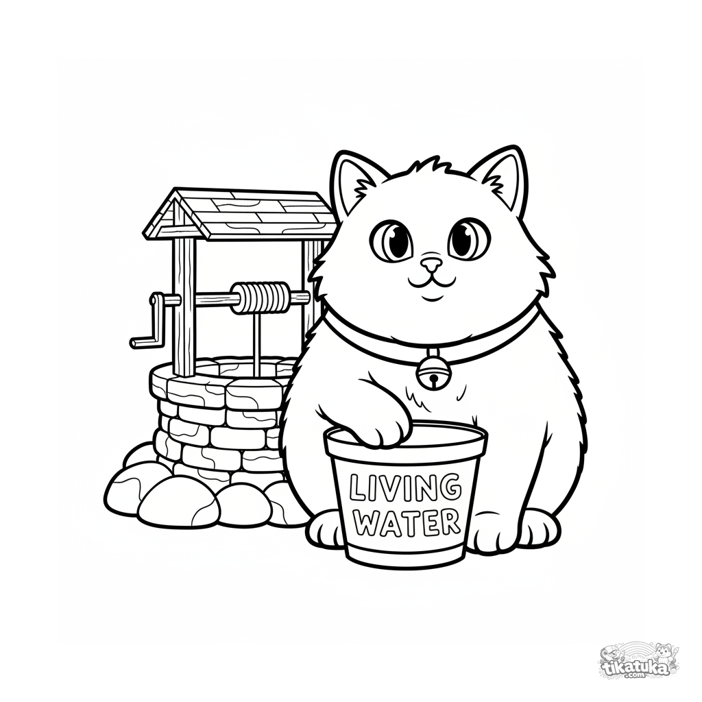 Página para colorir para crianças pequenas 2-3: um grande gato falante guardião está junto a um poço de água viva. Formas grandes e simples, contornos claros.