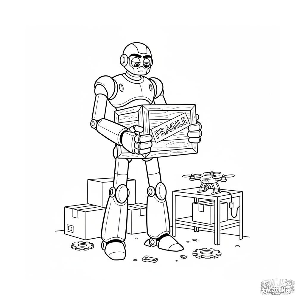 Página para colorir para crianças de 7 a 9 anos: um robô mecânico poderoso levanta um caixote em um armazém. Pose dinâmica, detalhes hidráulicos.