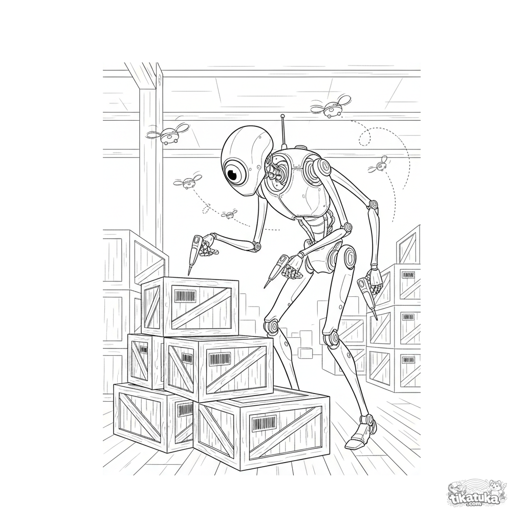 Página para colorir para crianças mais velhas 10-12: um robô scanner alto e realista inspecionando códigos de barras em caixotes em um armazém. Máquinas detalhadas, drones voadores.