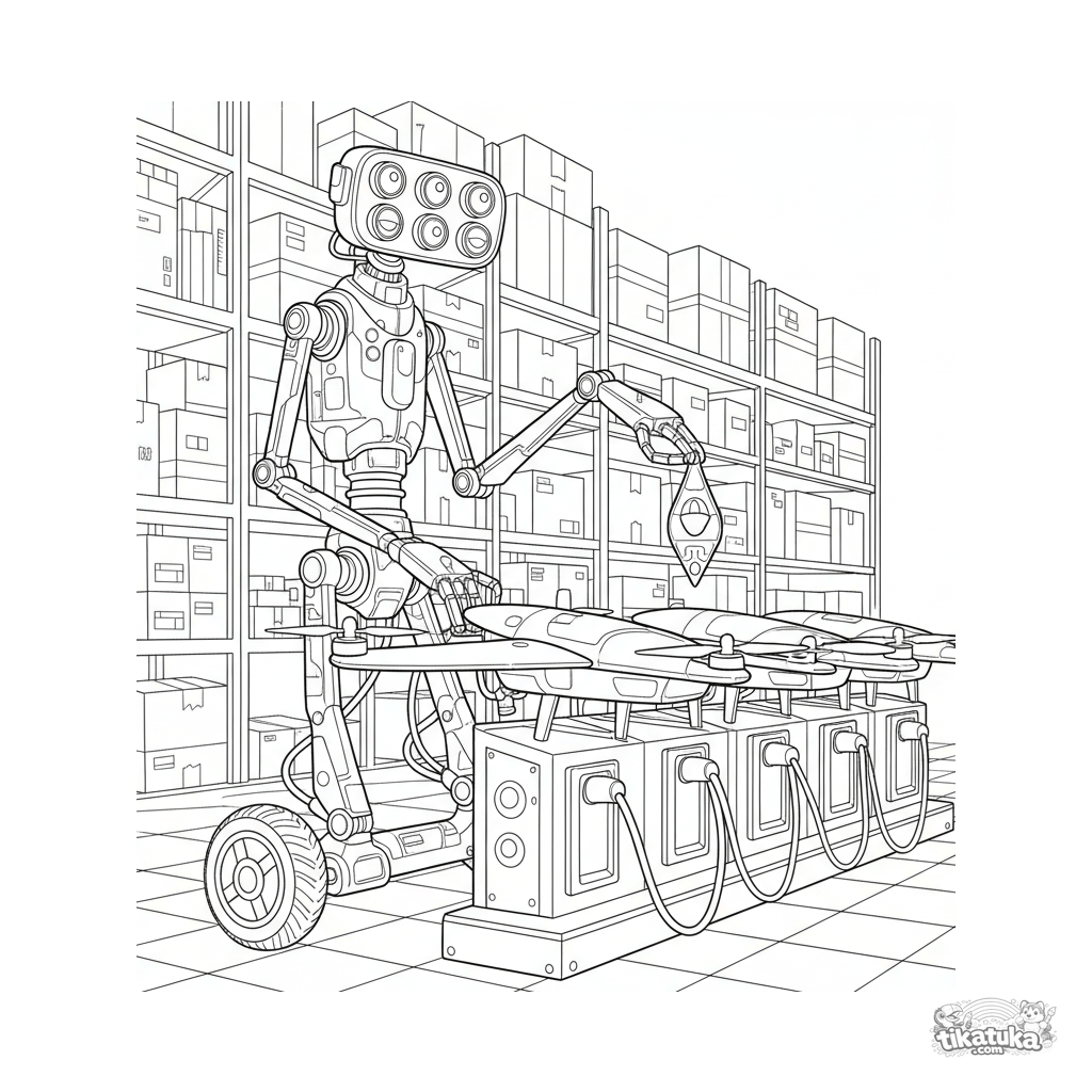 Página para colorir para crianças mais velhas 10-12: um robô scanner alto realizando verificações de manutenção em drones em um armazém. Contornos detalhados, estilo realista.