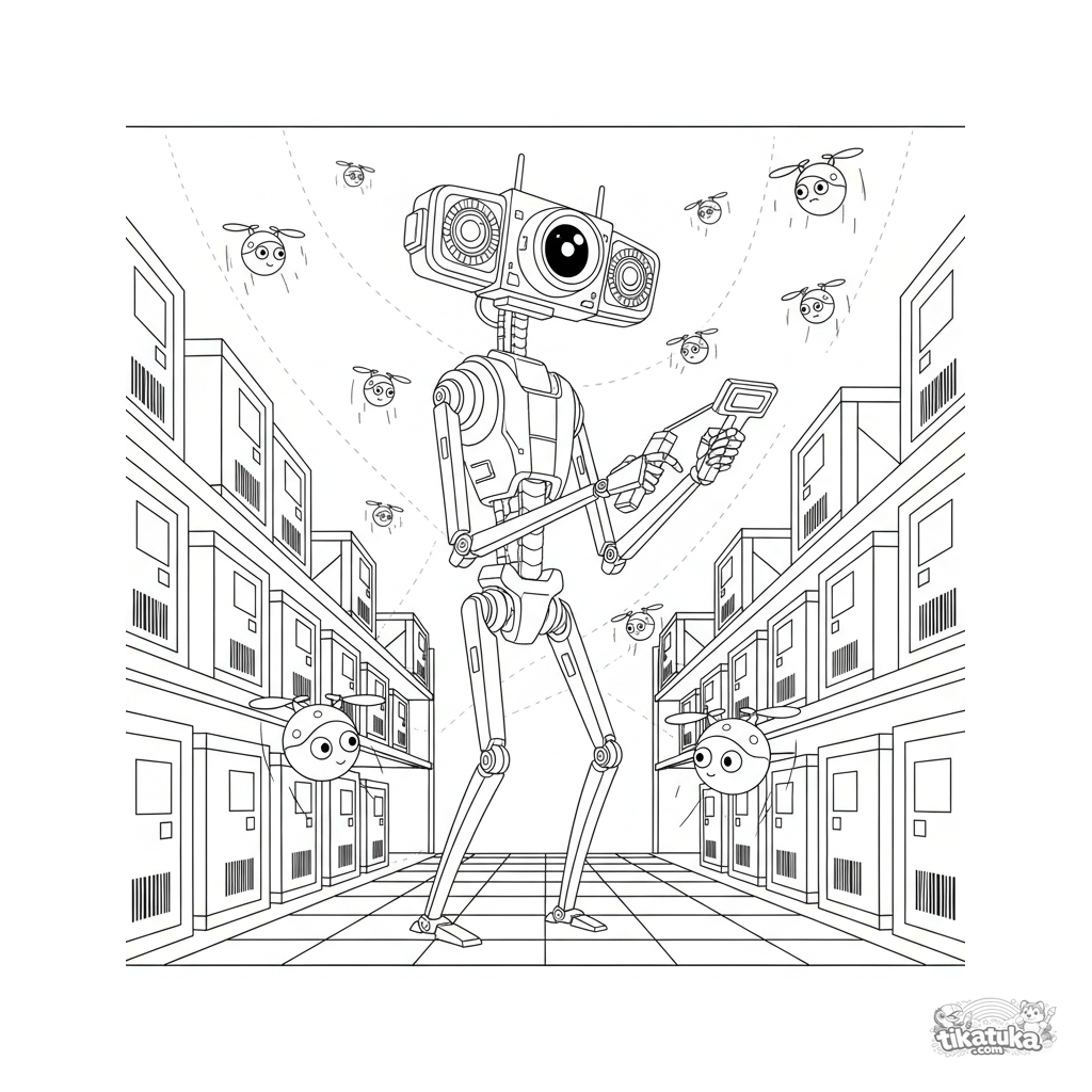Página para colorir para crianças maiores 10-12: um robô scanner alto verifica inventário em um armazém entre drones voadores. Estilo técnico detalhado.
