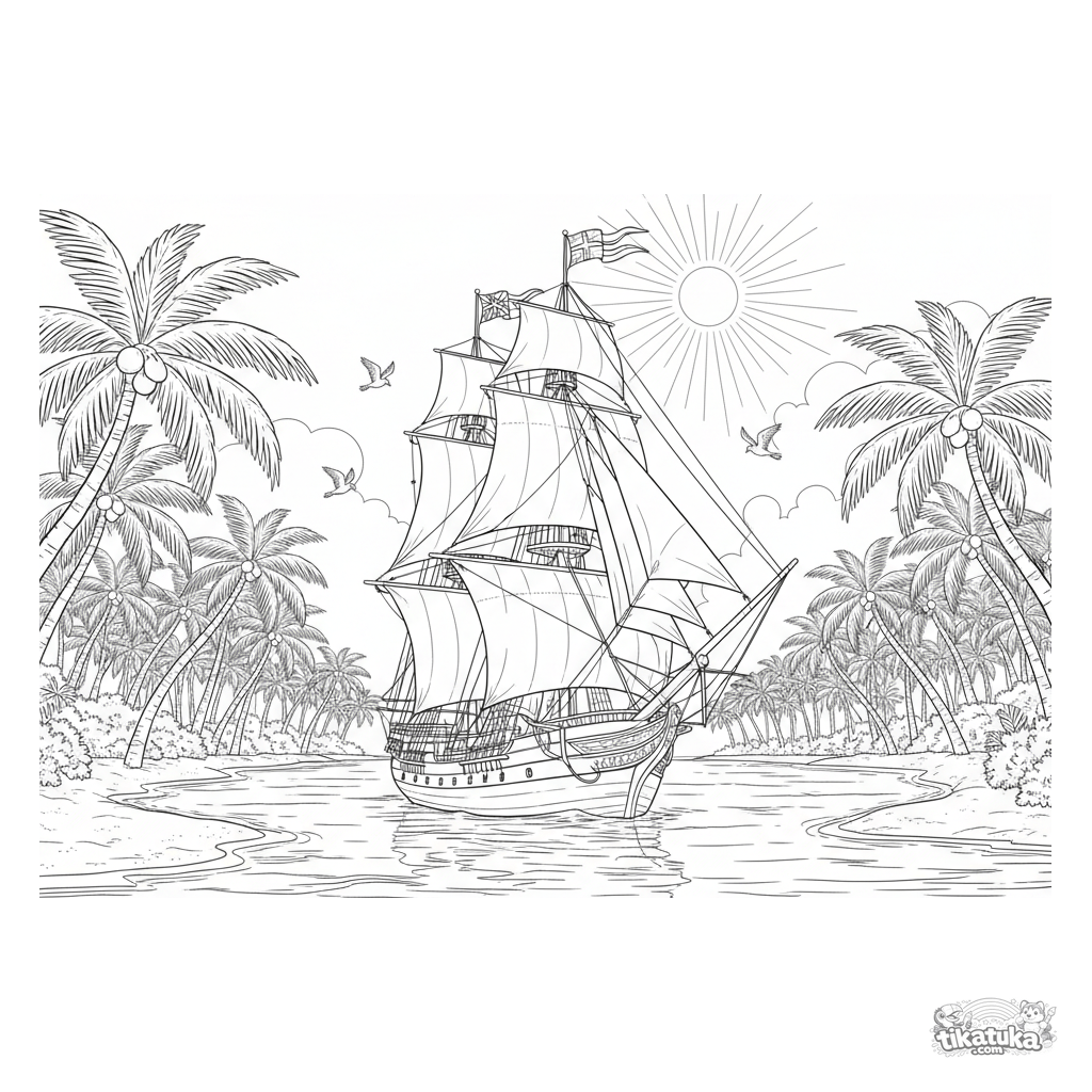 Página para colorir detalhada para crianças mais velhas de 10-12 anos: um majestoso navio de vela entrando em uma baía tropical. Cordame, velas e paisagem intrincados.