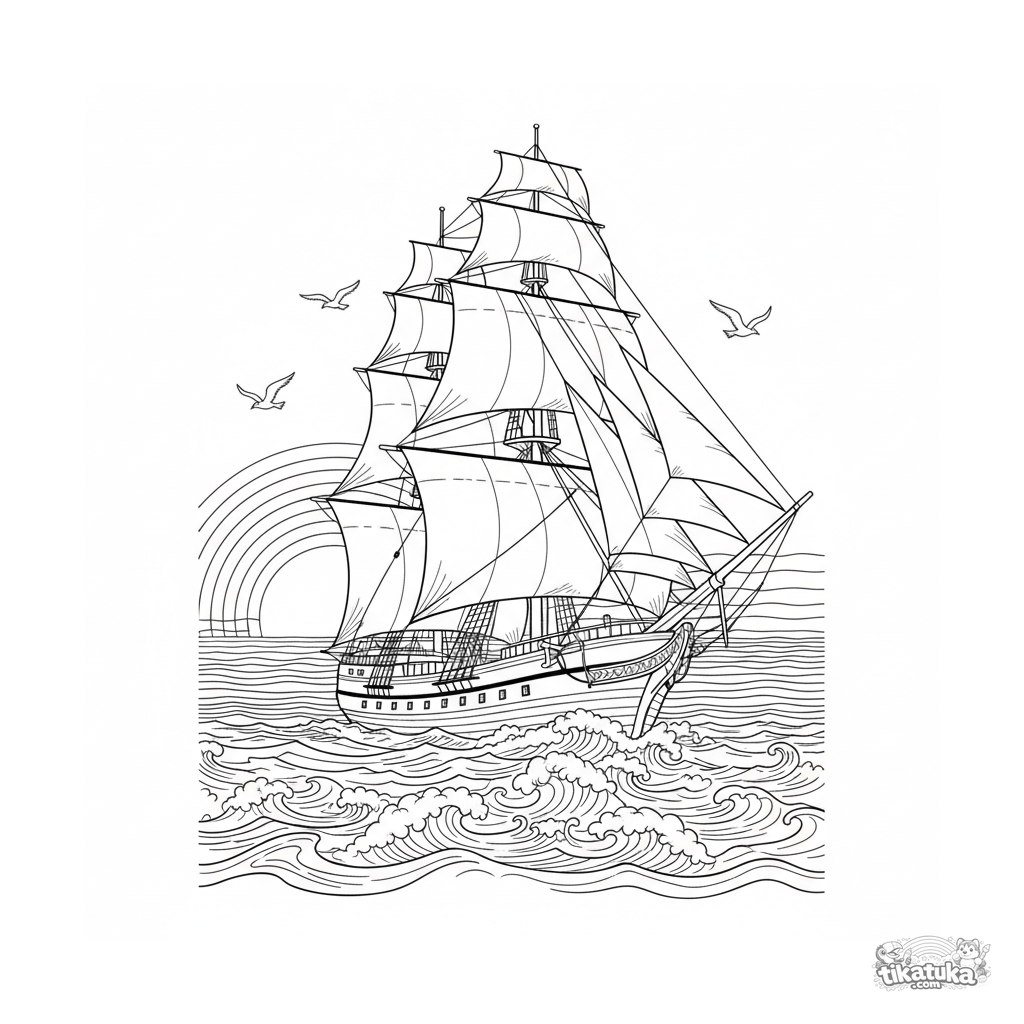 Página para colorir detalhada para crianças mais velhas 10-12: um majestoso navio de três mastros com velas cheias navega no mar contra um pôr do sol. Cordame e mastros detalhados.