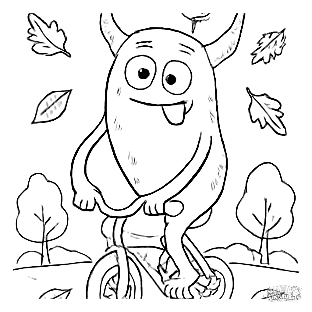 Página para colorir de um monstro alto aprendendo a andar de triciclo em um parque de outono. Para crianças de 5 a 8 anos.