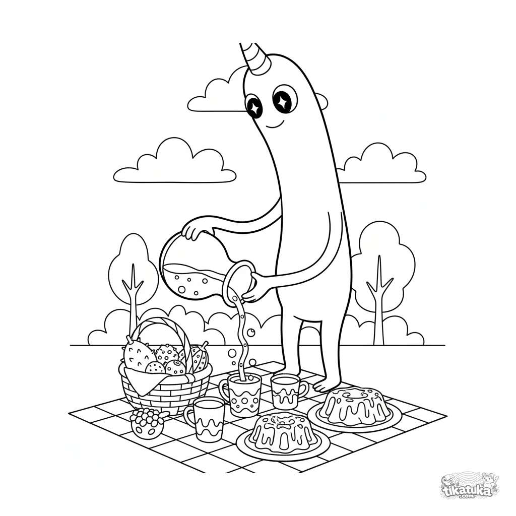 Página para colorir de um monstro alto servindo suco monstro com bolhas em um piquenique. Para crianças de 4-6 anos. Cena divertida com doces monstros.