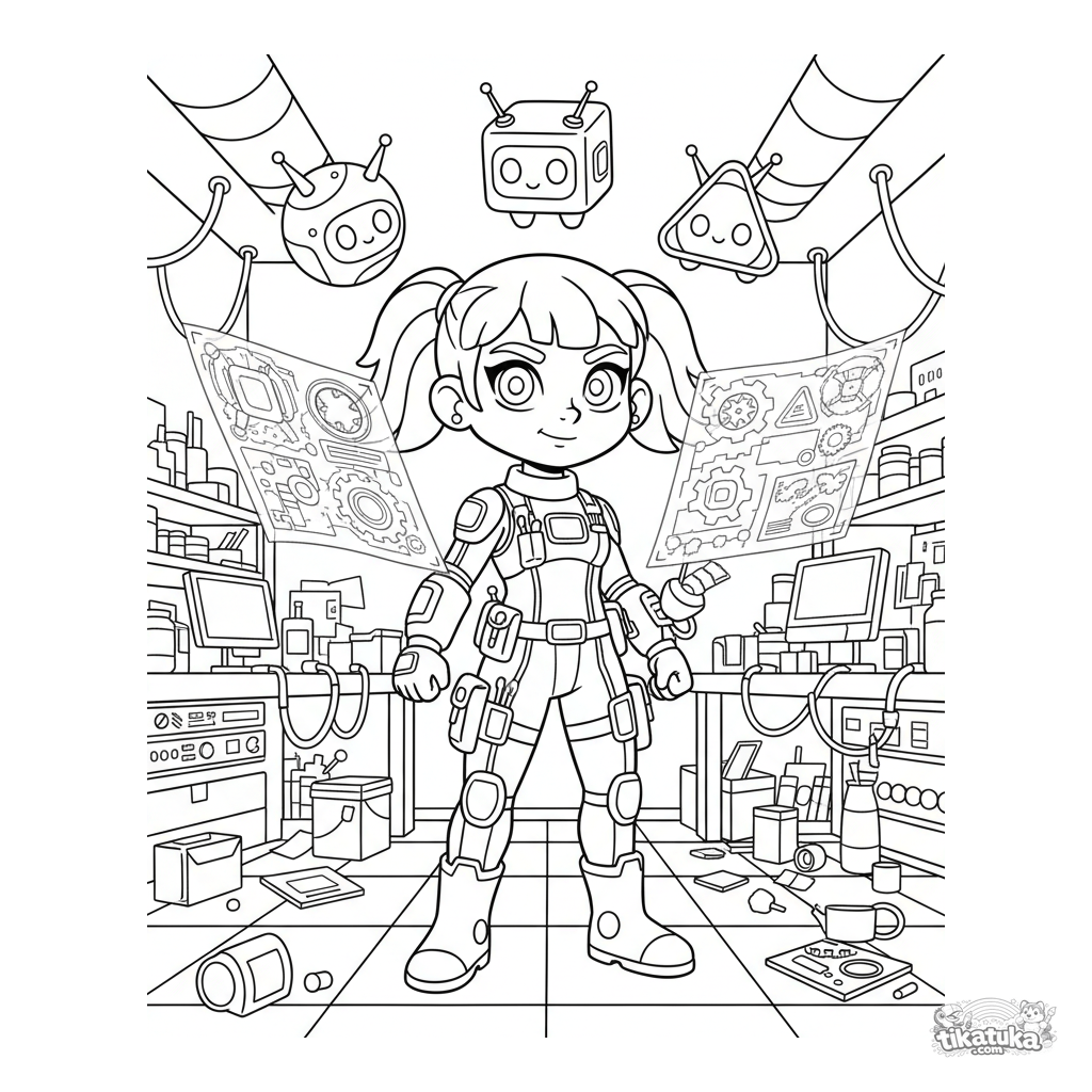 Página para colorir para crianças 7-9: um super-herói inventor comanda drones ajudantes em um laboratório subterrâneo com plantas holográficas.