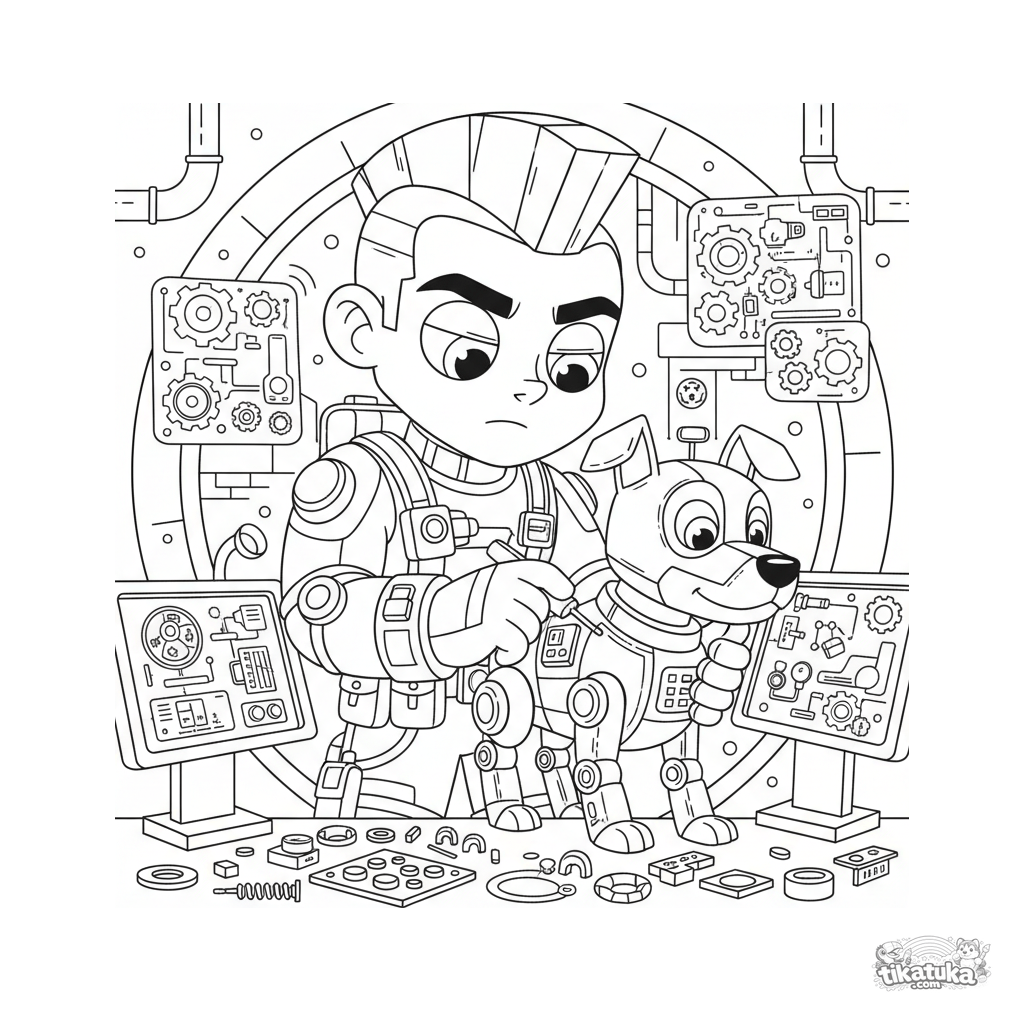 Página para colorir para 10-12 anos: um super-herói inventor com ferramentas repara um cachorro robô em um laboratório subterrâneo, cercado por esquemas holográficos.