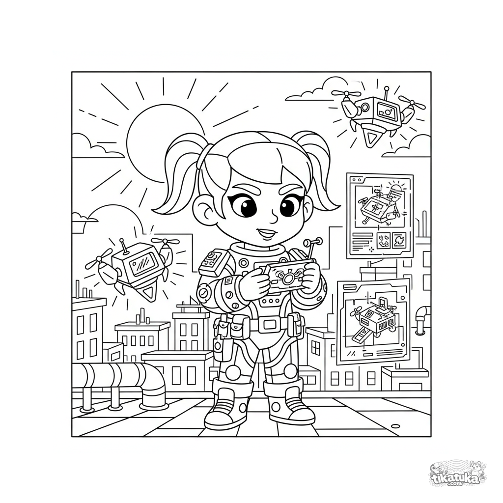 Página para colorir para pré-adolescentes 7-9: uma super-heroína inventora calibra seus drones ajudantes em um laboratório no telhado ao pôr do sol.