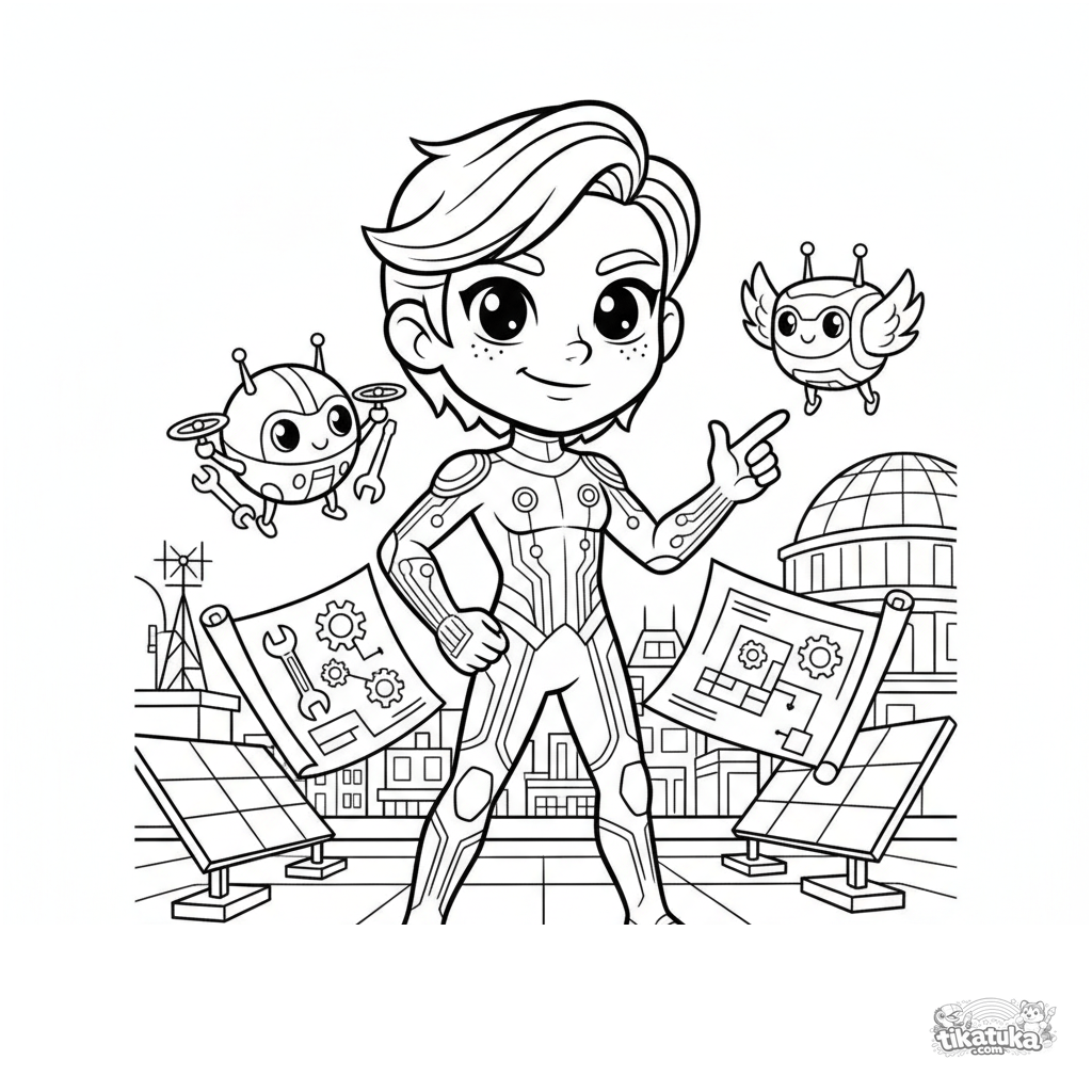 Página para colorir para pré-adolescentes 7-9: um super-herói inventor em traje tecnológico comanda drones ajudantes em um laboratório no telhado.