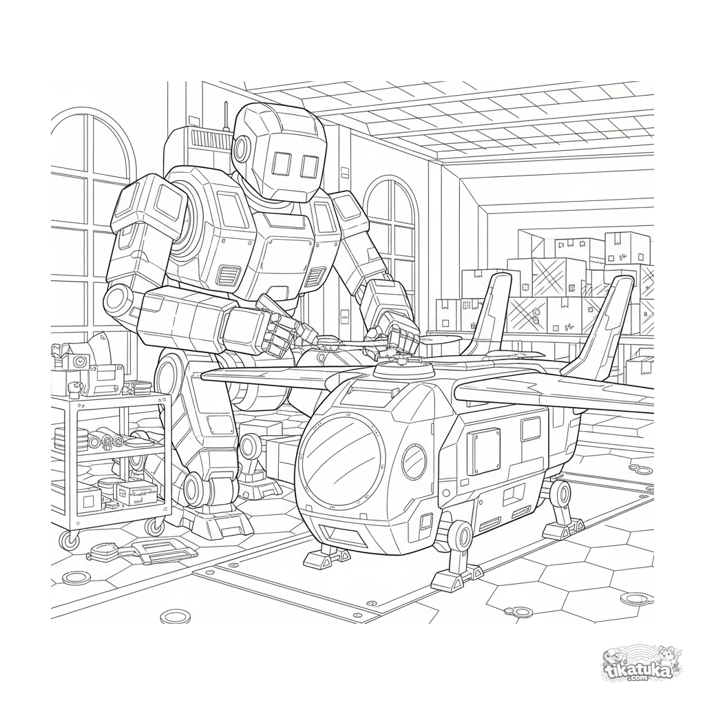 Página complexa para colorir para crianças de 10-12 anos: um mec robô técnico consertando um drone em um armazém. Trabalho de linha detalhado, estilo técnico para entusiastas.