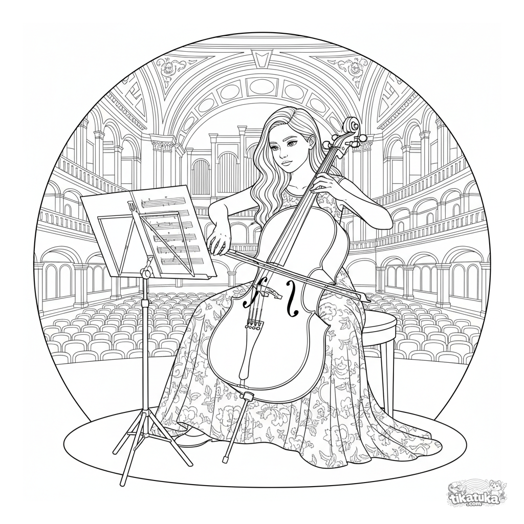 Página para colorir detalhada para 10-12 anos: uma violoncelista adolescente em vestido de concerto toca música em um palco de sala de concertos sob holofotes.