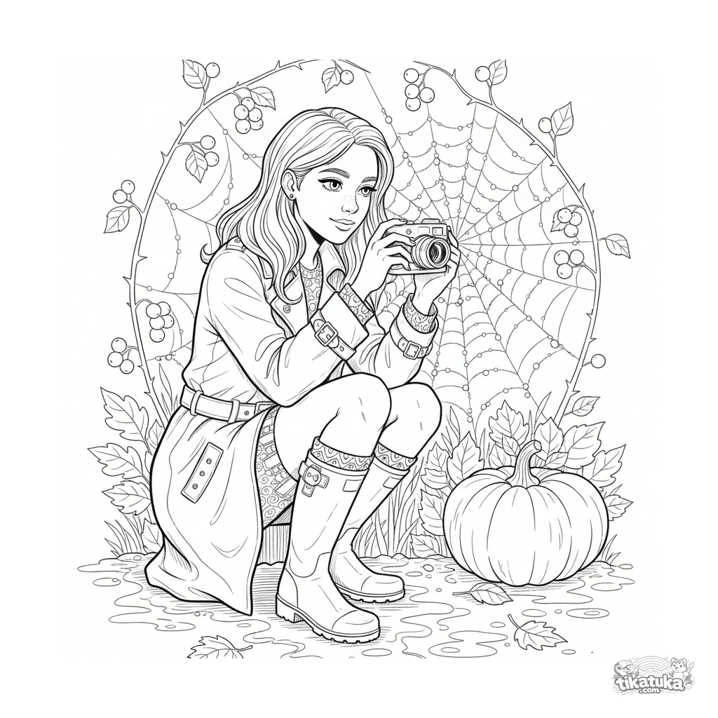 Página para colorir para crianças maiores 10-12: um adolescente com botas de borracha fotografa gotas de chuva em uma teia em um jardim de outono.