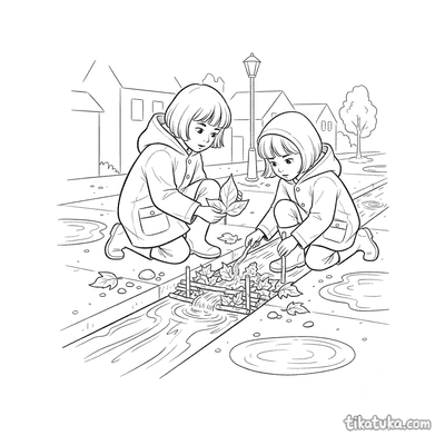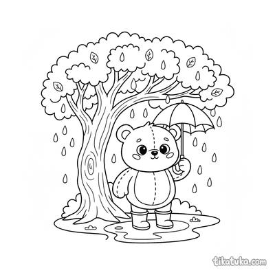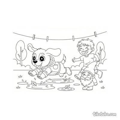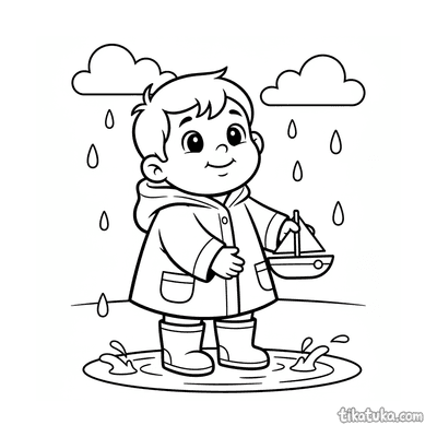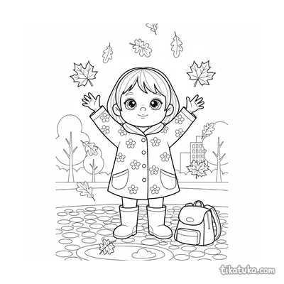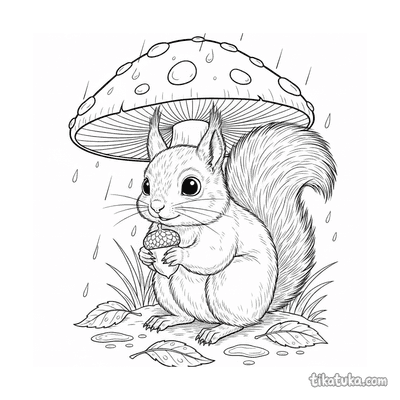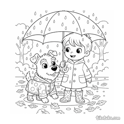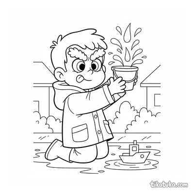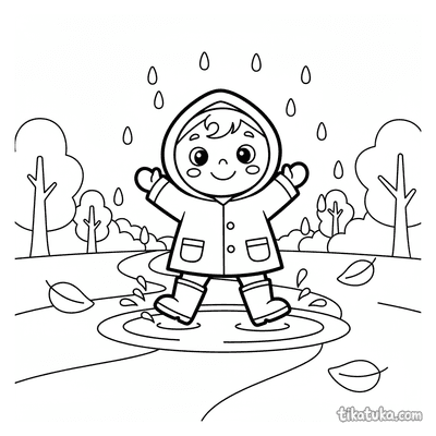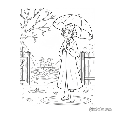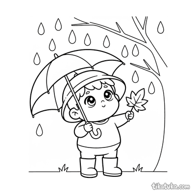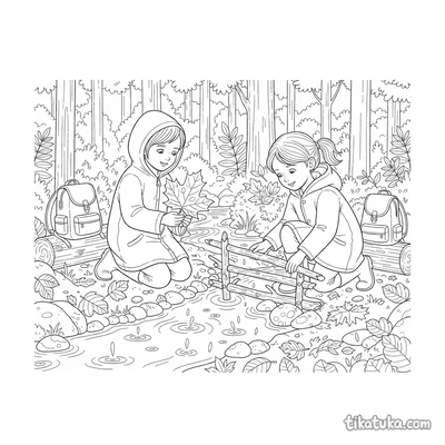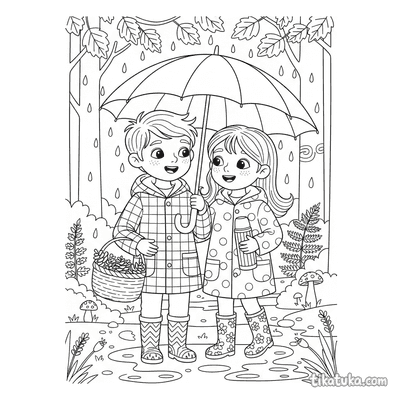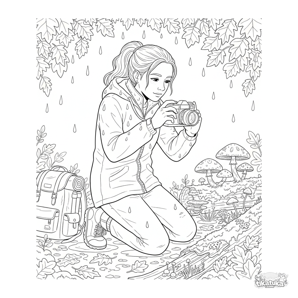 Página para colorir para crianças de 10-12 anos: um adolescente de roupa de chuva fotografa cogumelos em um tronco musgoso na floresta de outono na chuva. Detalhe de guia de campo.