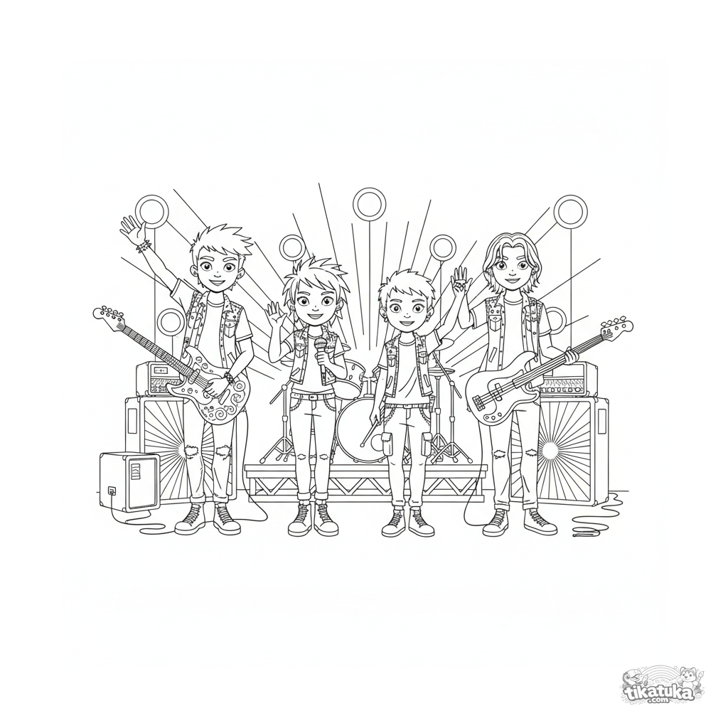 Página para colorir detalhada para 10-12 anos: uma banda de rock adolescente a agradecer num grande palco. Com guitarra, microfone, bateria.