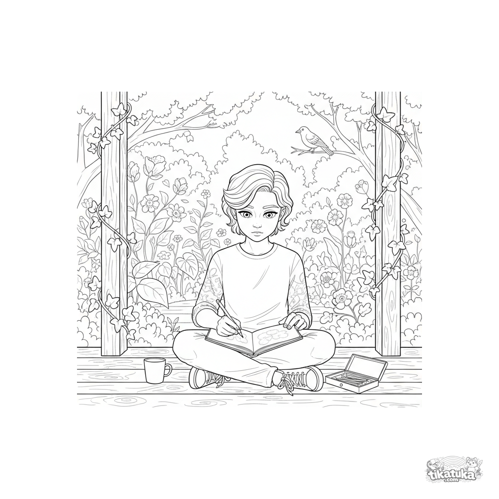 Página para colorir detalhada para crianças maiores de 10-12 anos: um adolescente desenhando a vista do jardim da varanda de verão. Uma xícara de chá e lápis por perto.