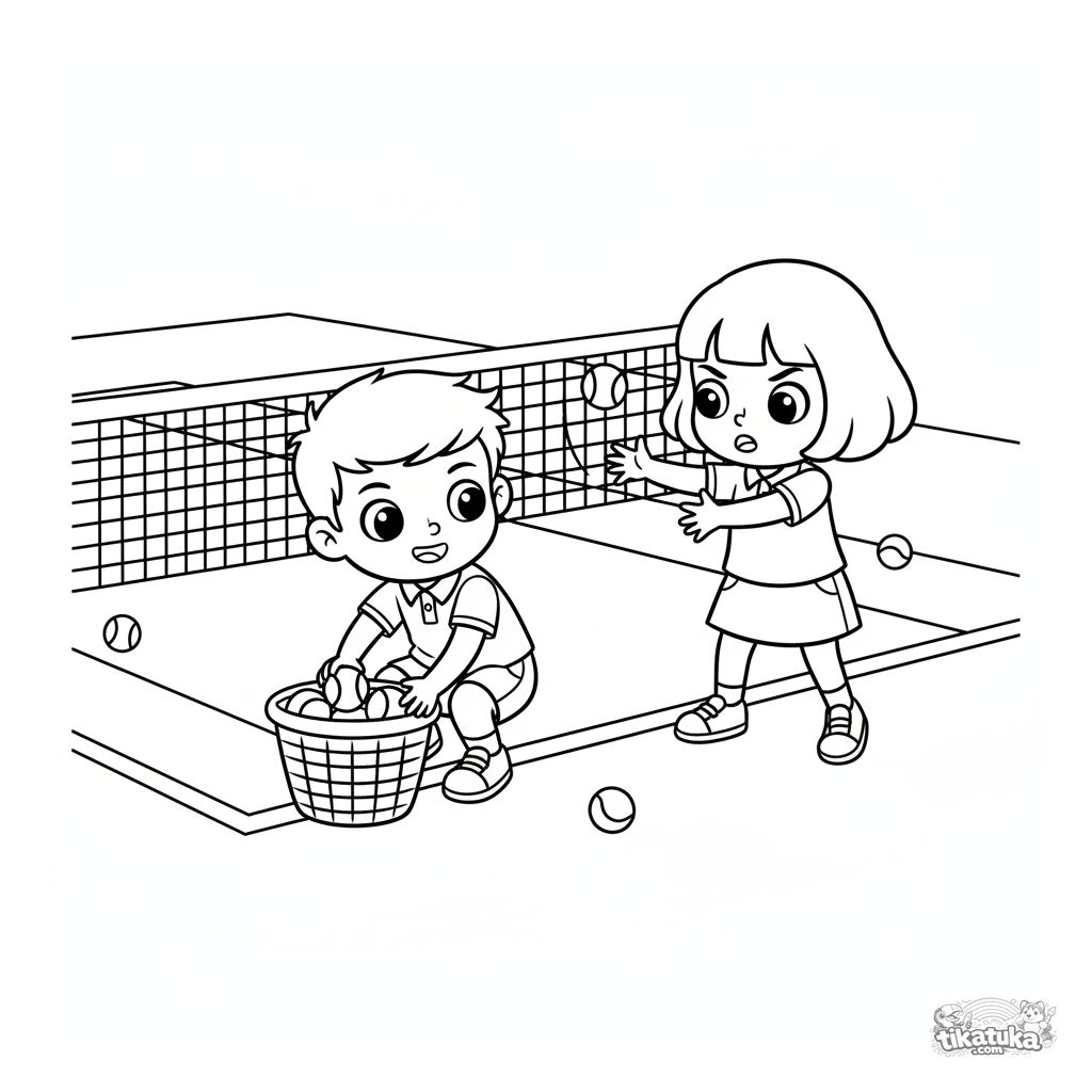 Página para colorir para crianças de 7-9 anos: ajudantes em uma quadra de tênis pegam e coletam bolas.
