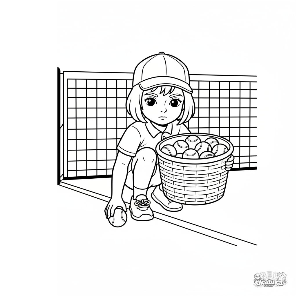 Página para colorir para crianças de 7-9 anos: um gandula em uma quadra de tênis com uma cesta de bolas. Cena mostra um papel importante, mas menos visível.