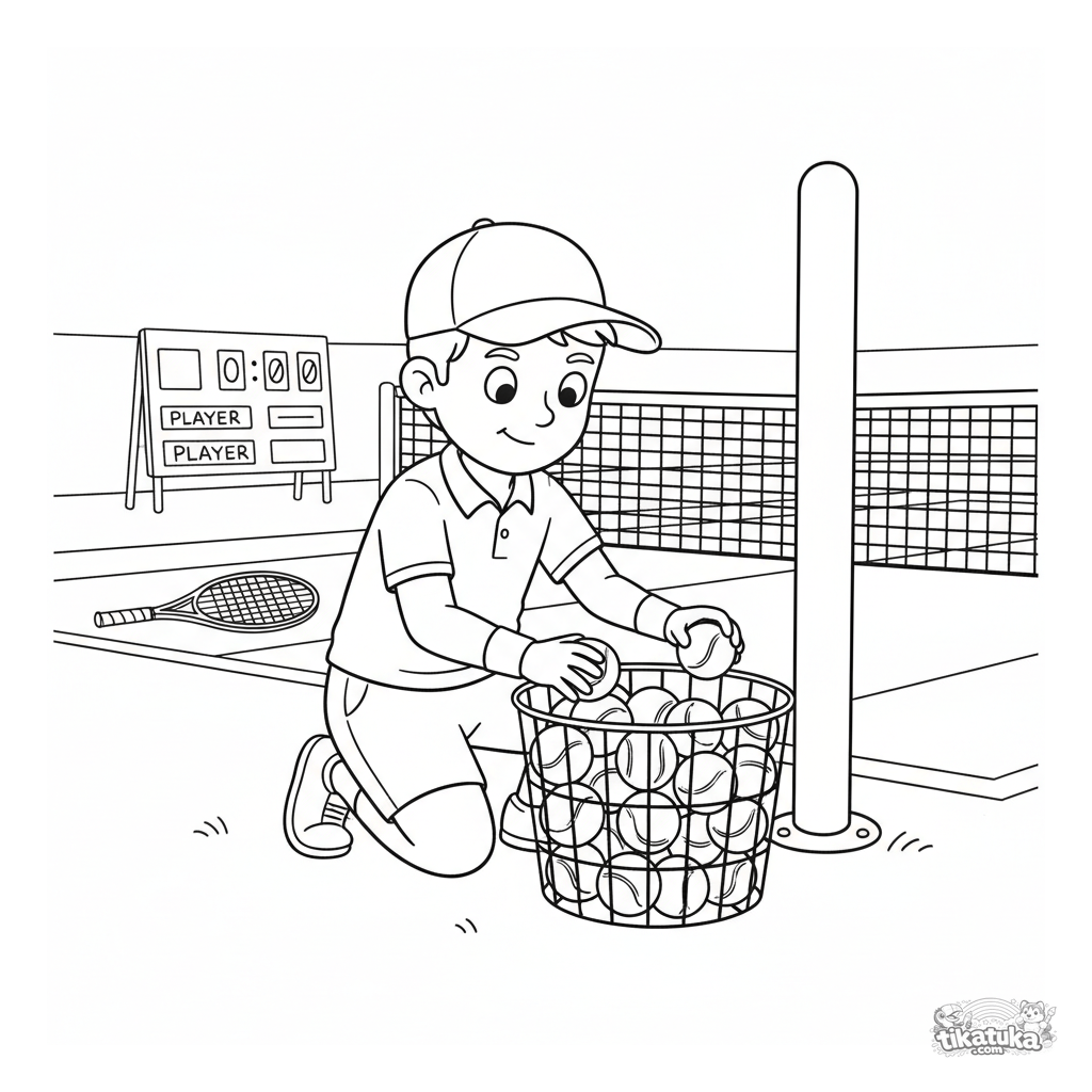 Página para colorir para crianças 7-9: um apanhador de bolas de tênis com uma cesta junto à rede na quadra. Mostra um papel de apoio importante nos esportes.