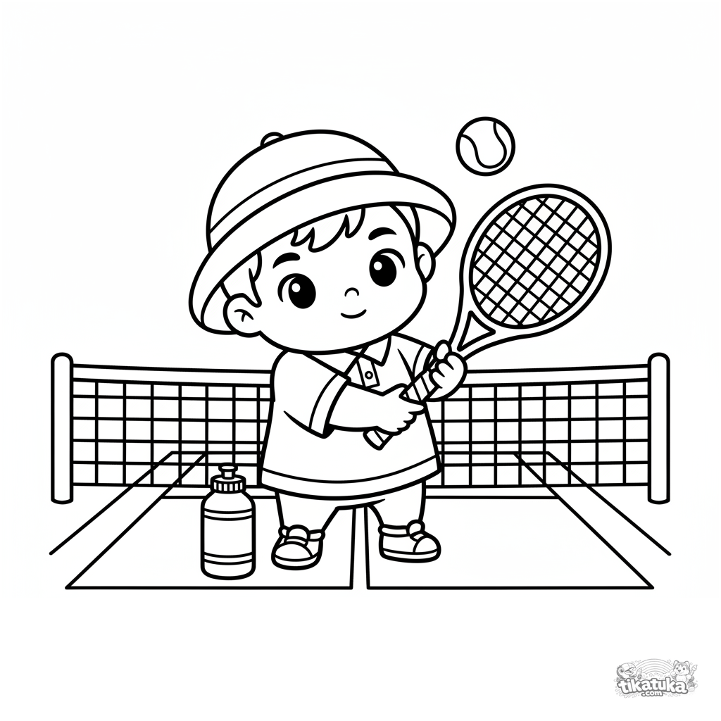 Página para colorir para crianças de 2-3 anos: criança alegre em uma quadra de tênis prestes a sacar. Formas simples, margens amplas.