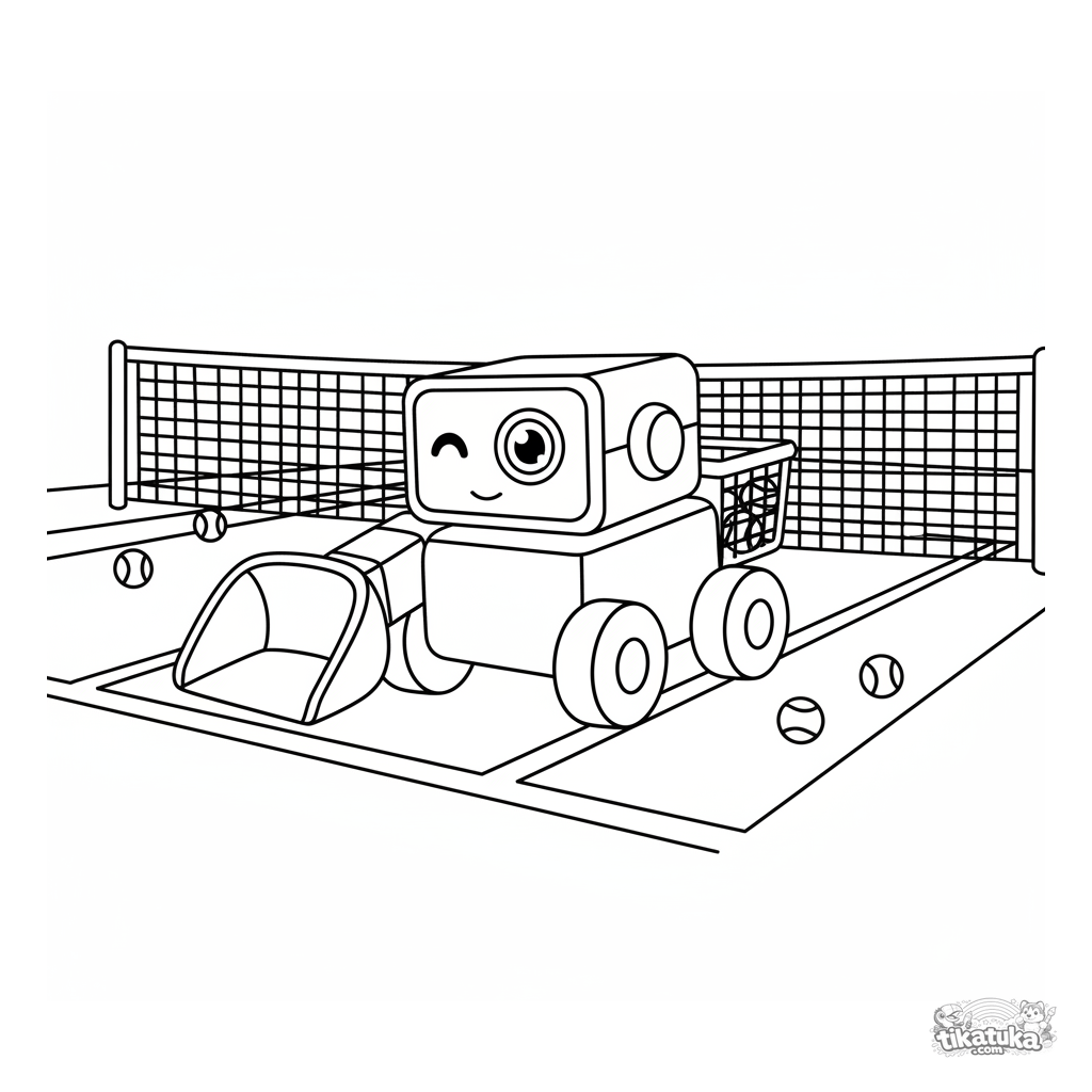 Página para colorir de um robô ajudante em uma quadra de tênis para crianças de 4-6 anos. Um robô fofo coleta bolas espalhadas.