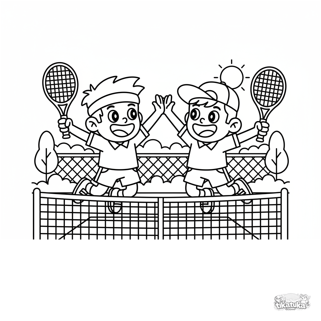 Página para colorir para 7-9 anos: uma equipe de duplas de tênis comemora com 'toca aqui' sobre a rede após ganhar um ponto. Cena dinâmica com dois jogadores de uniformes combinando.