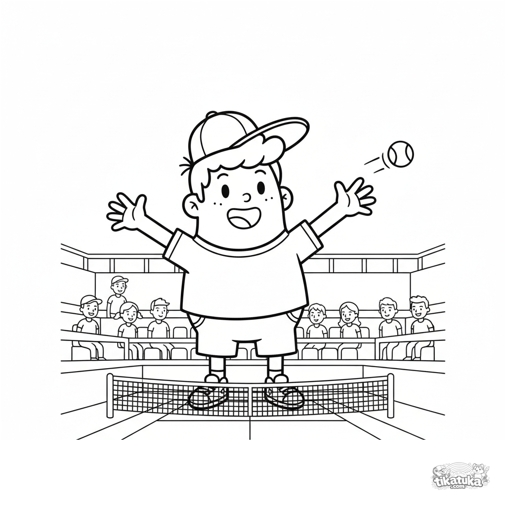 Página para colorir para crianças 4-6 anos: fã em jogo de tênis pega bola que voou para arquibancadas. Momento divertido com vista da quadra e rede.