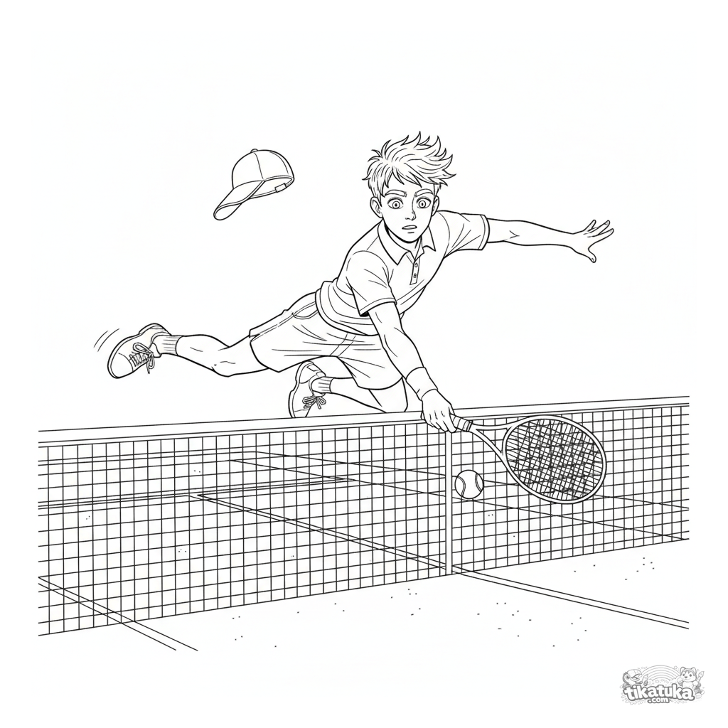 Página para colorir detalhada para 10-12: um tenista em um mergulho dinâmico para um drop shot na rede. Anatomia detalhada, quadra de saibro.