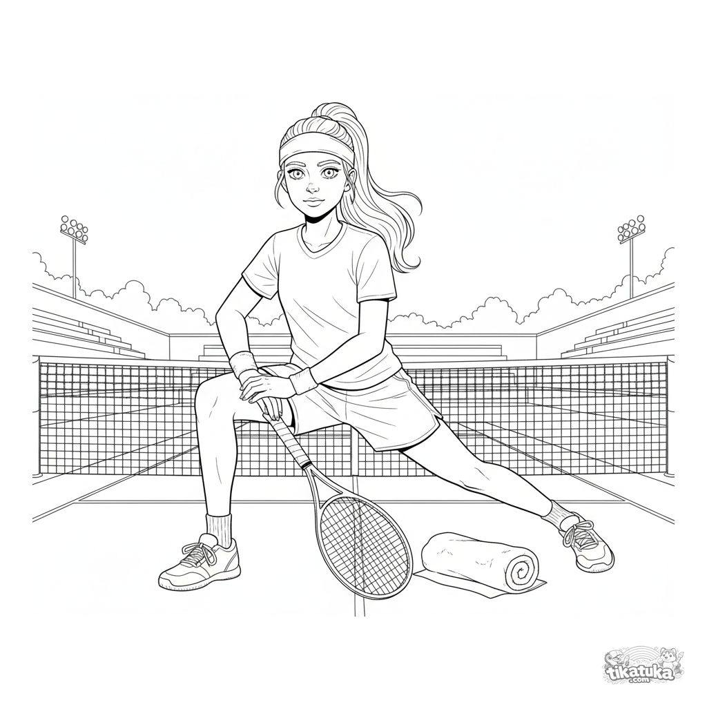 Página detalhada para colorir para crianças 10-12 anos: um tenista adolescente alongando na quadra antes de uma partida. Detalhes de roupa, raquete, toalha e linhas.