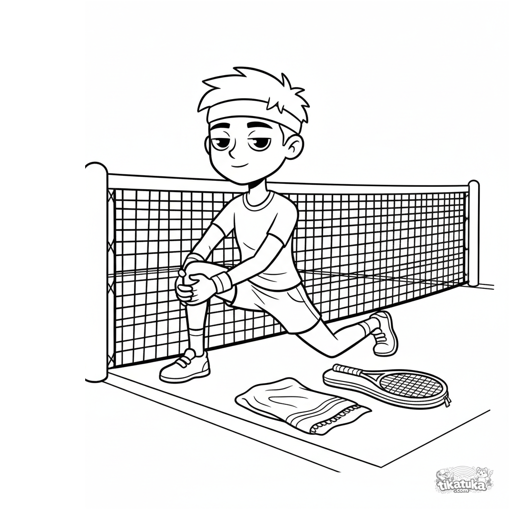 Página para colorir para 10-12 anos: um tenista se alonga no poste da rede antes de uma partida. Cena detalhada com toalha, capa de raquete e roupa esportiva.