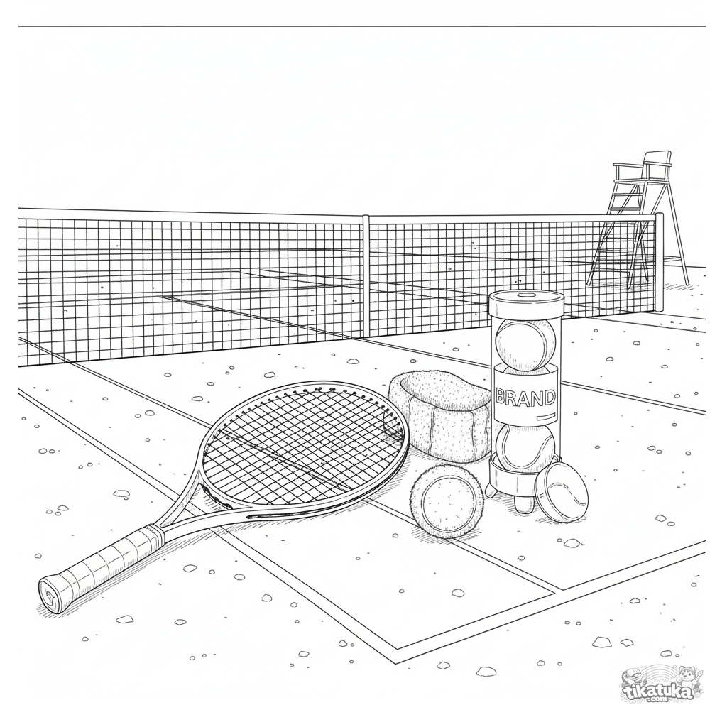 Página para colorir intrincada para 10-12: uma natureza-morta detalhada de uma raquete e bola de tênis. Estilo técnico, linhas limpas, texturas.
