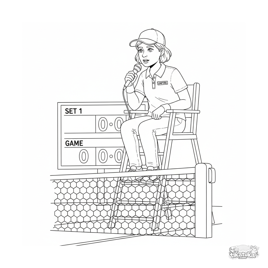 Página para colorir para crianças de 4-6 anos: um árbitro em uma quadra de tênis sentado em uma cadeira alta falando em um microfone. Cena educativa.