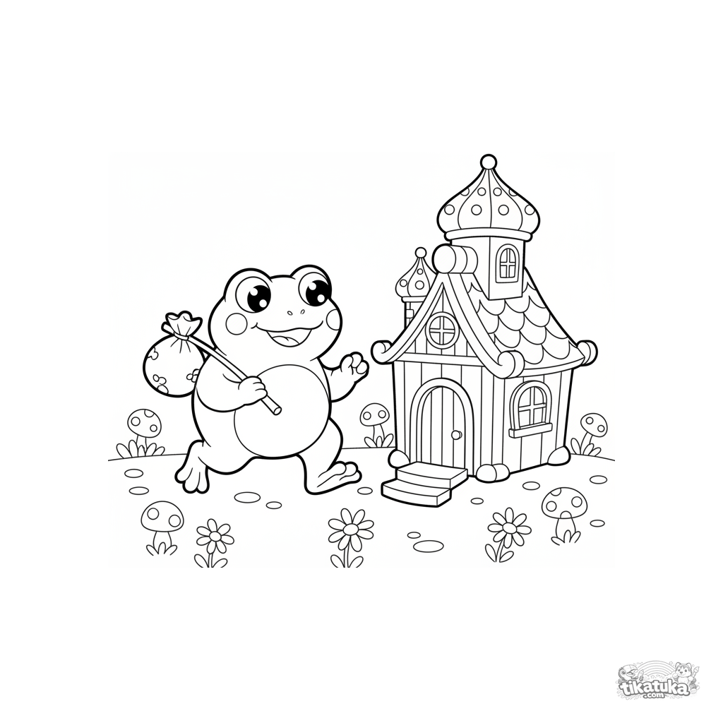 Página simples para colorir para bebês do conto Teremok. Um sapo pula para a casinha em um prado. Formas grandes, contornos grossos, para 2-3 anos.